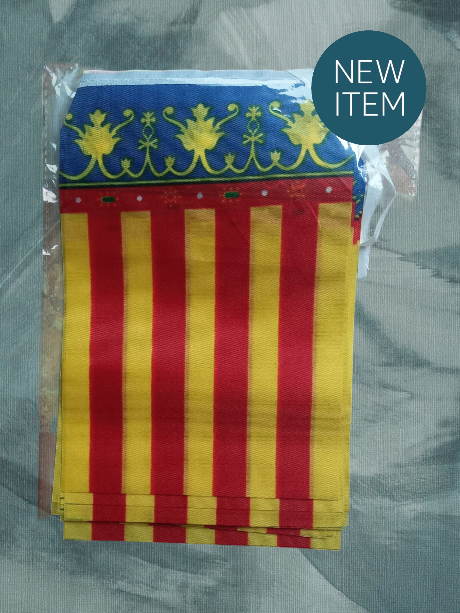 GUIRNALDA DE VALENCIA BANDERA VALENCIANA PARA COLGAR EN SUS FALLAS,TIENDAS O CONVENCIONES DE FALLAS FABRICADAS EN TELA PLASTICA CON CUERDA PARA COLGAR 10 METROS CON 20 BANDERAS DE LONGITUD.